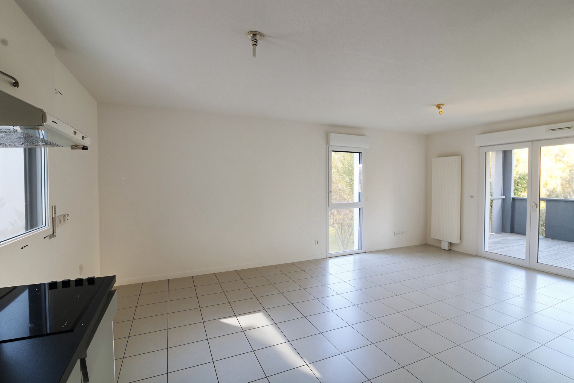 Le séjour de près de 30m2 s'ouvre sur une terrasse couverte de 12m2 au calme.