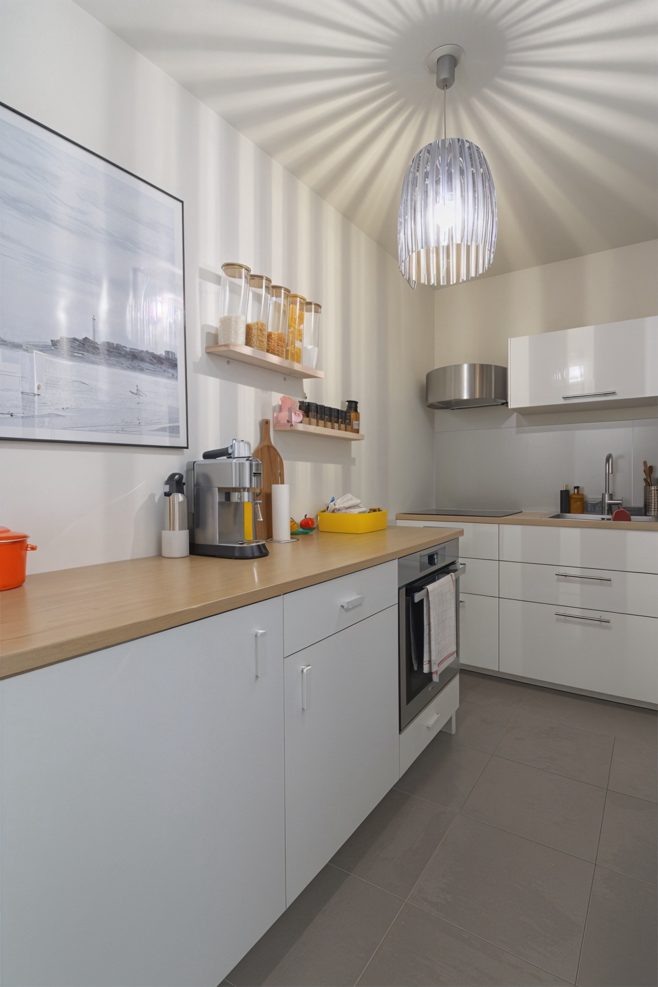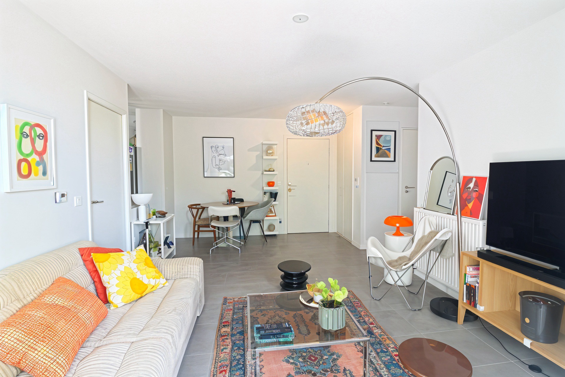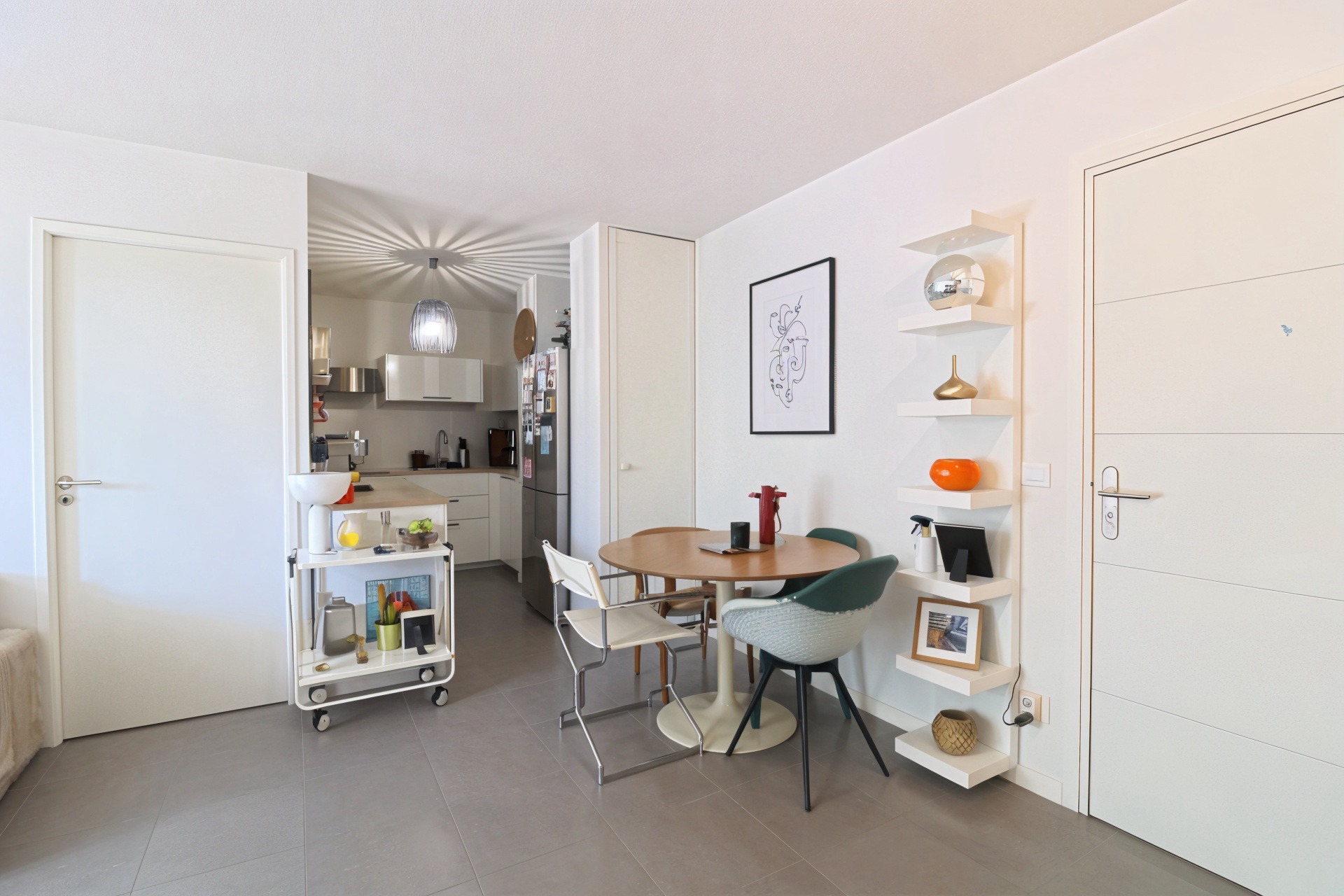 Une entrée menant à un espace de vie lumineux, comprenant un salon / salle à manger avec cuisine ouverte et aménagée,