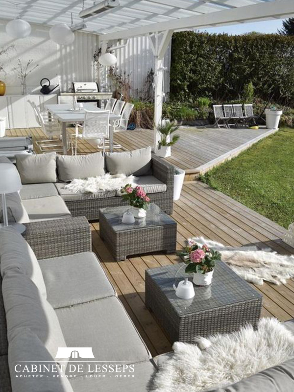 Organisée en duplex, son RDC est organisé autour d'une lumineuse pièce de vie d'environ 26 m², regroupant salon et cuisine. L'accès au jardin se fait par deux larges baies vitrées. On retrouve également sur ce niveau une salle de bains et un espace de rangement sous l'escalier.