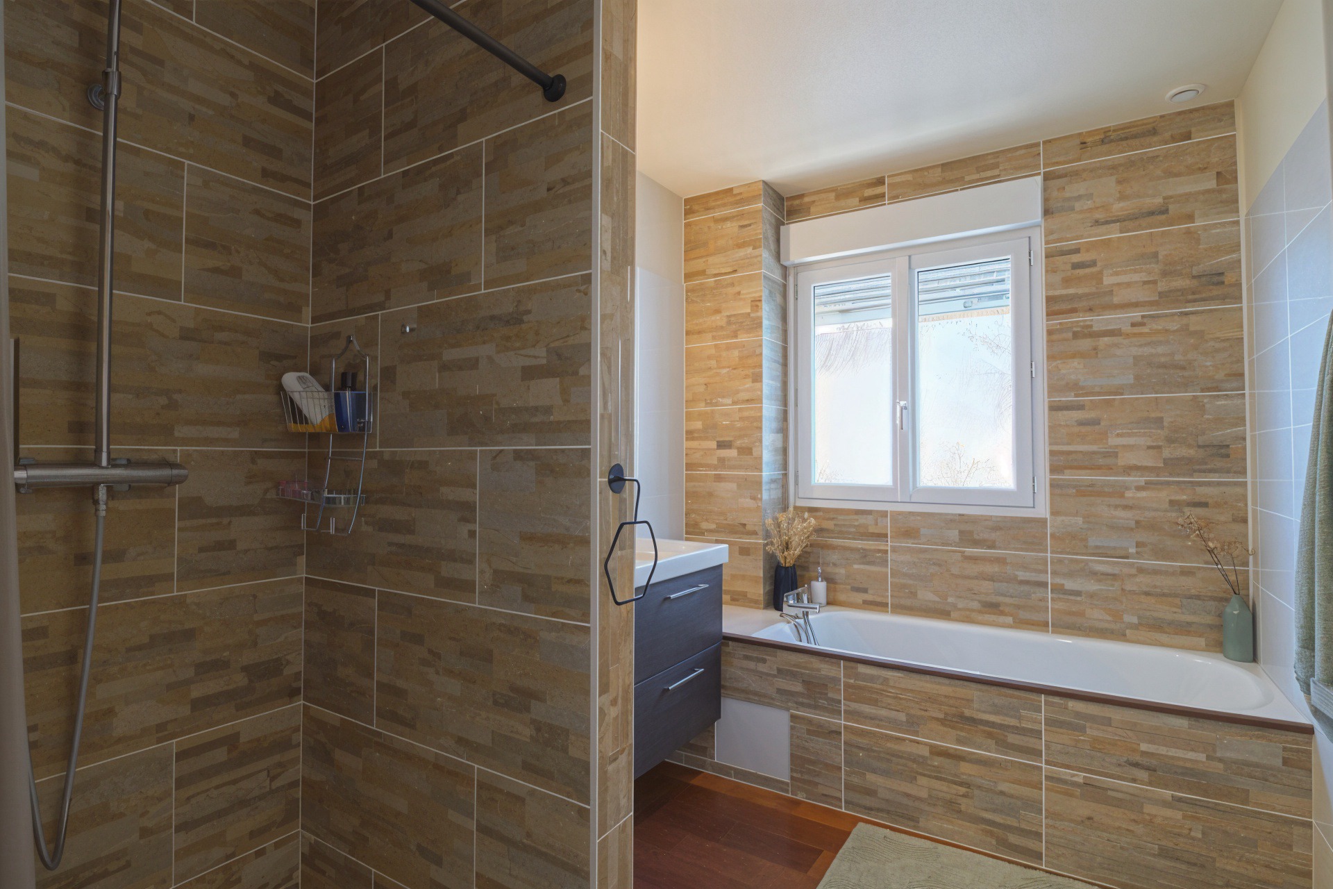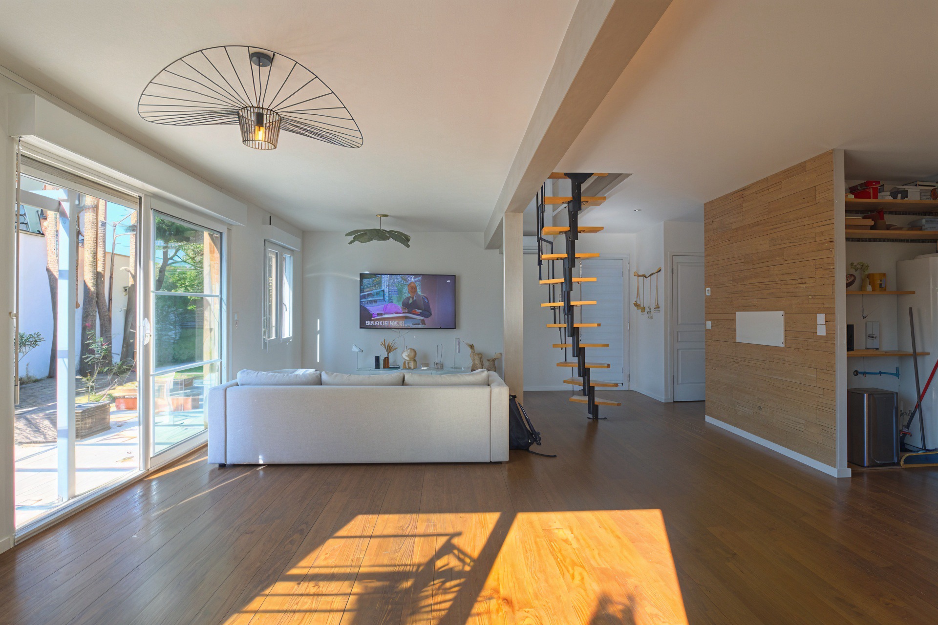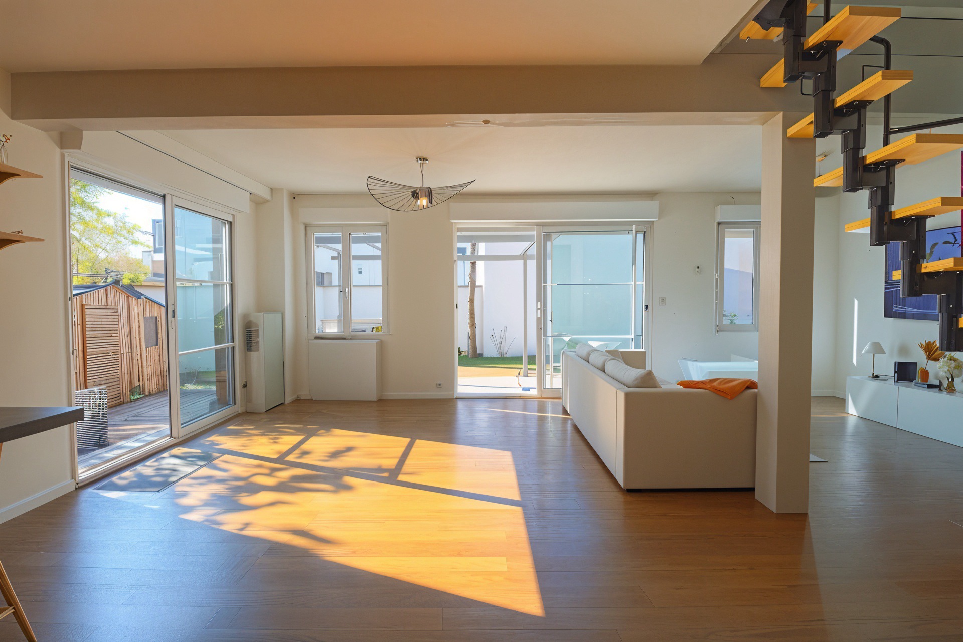 Au rez-de-chaussée, l’entrée s’ouvre sur un agréable espace de vie comprenant un séjour lumineux grâce à de larges baies vitrées donnant accès à deux terrasses exposées sud-ouest. La cuisine, entièrement équipée et ouverte sur le séjour, crée une atmosphère conviviale. On trouve également un premier toilette indépendant à ce niveau.