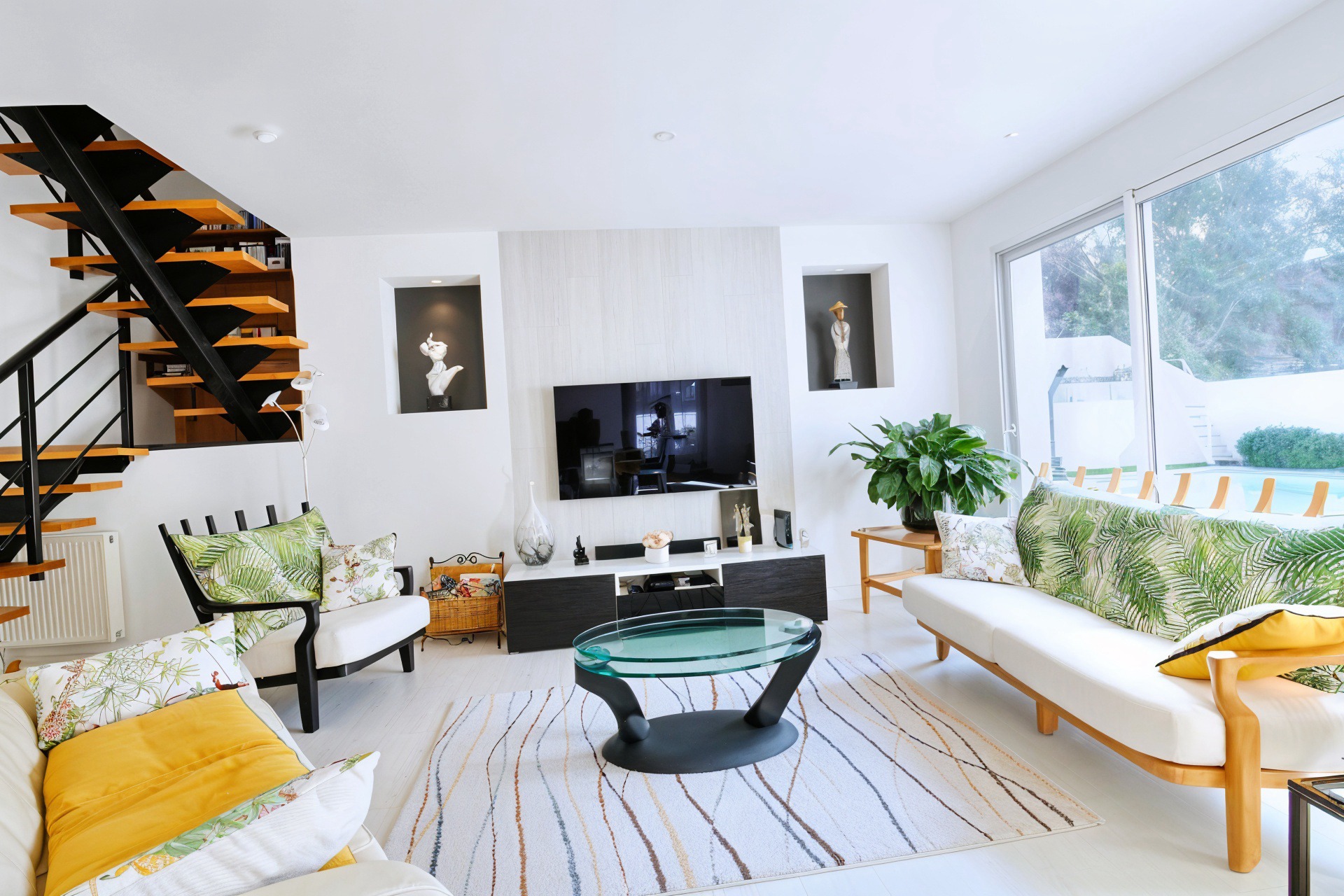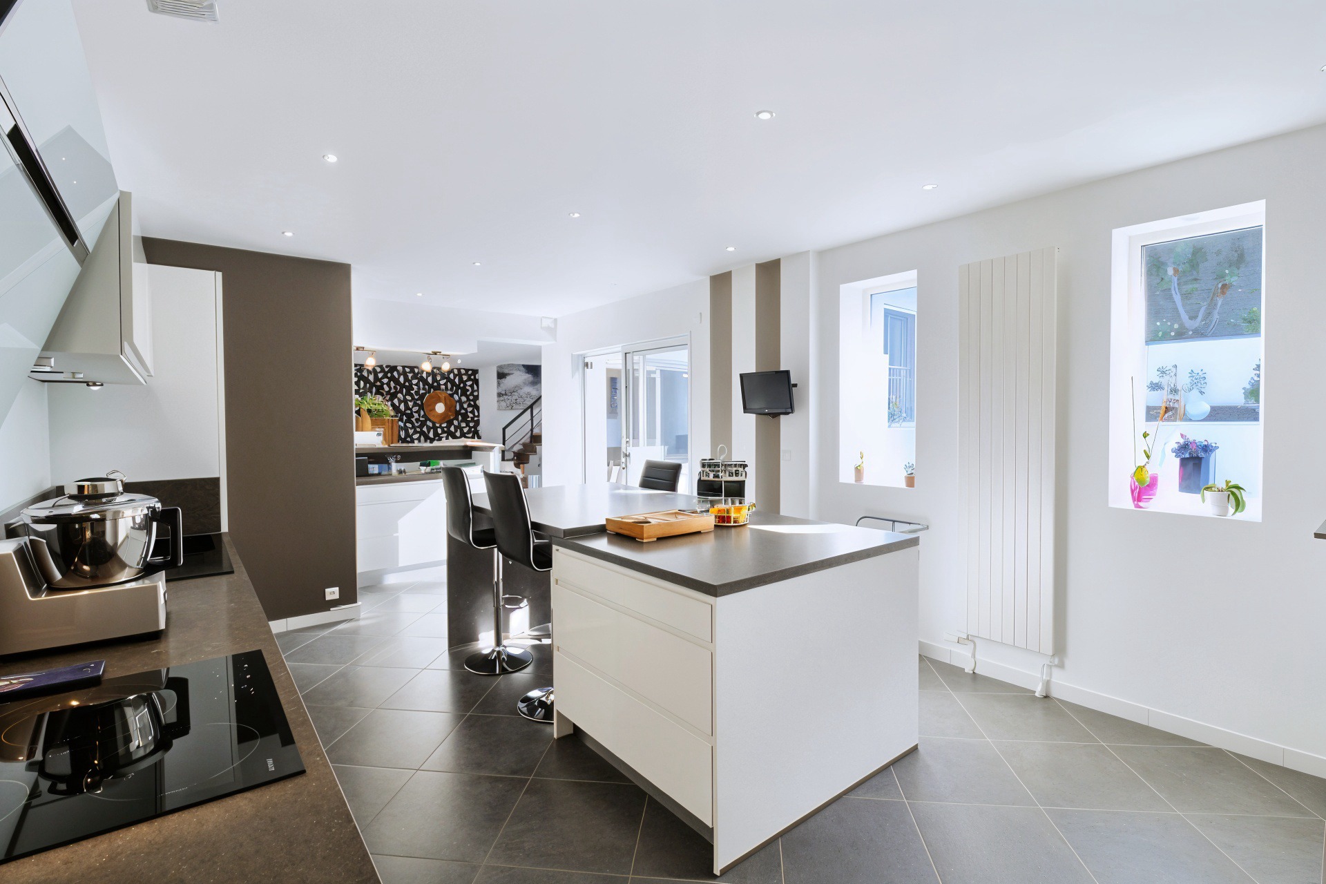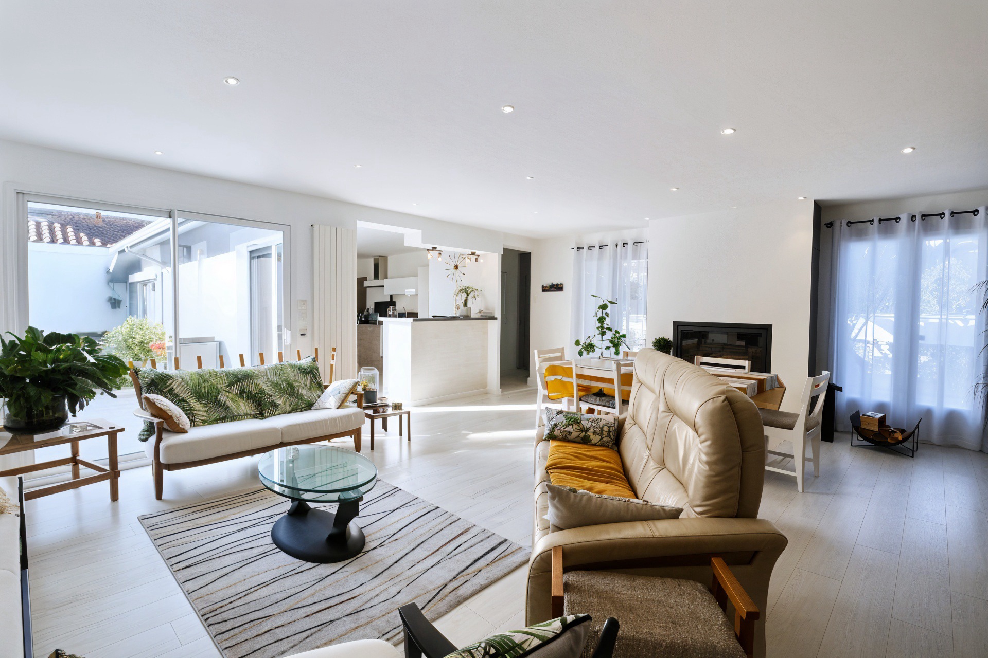 Le rez-de-chaussée se compose notamment d'un séjour de près de 40m2 aux nombreuses expositions lui garantissant une luminosité optimale tout au long de la journée ainsi qu'une vaste cuisine équipée s'ouvrant sur la terrasse.