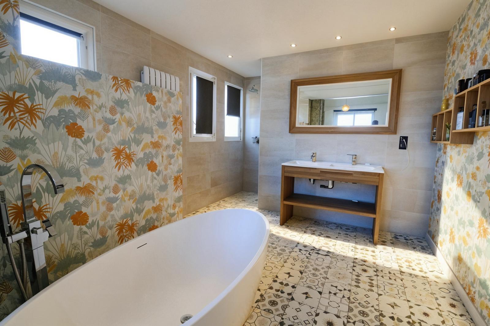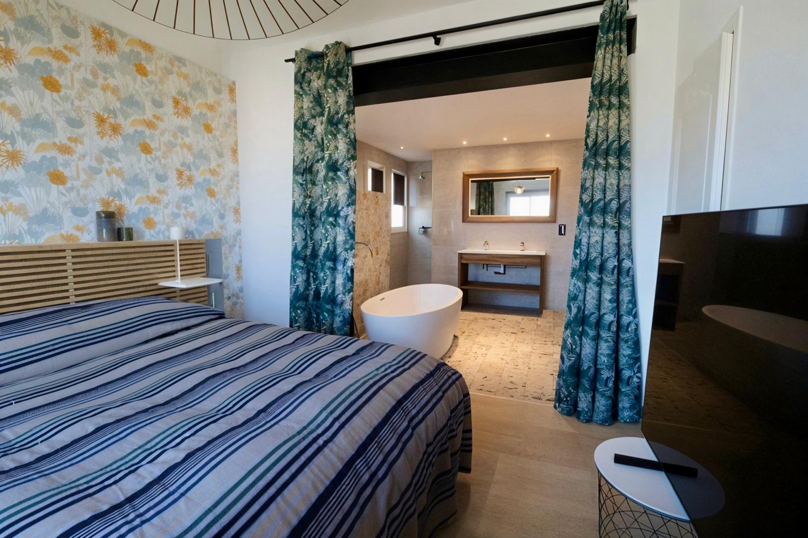En R+1, se situe la maison principale de 150 m2 avec son majestueux salon de 72 m2 avec sa cheminée et sa cuisine ouverte tout équipée, donnant accès sur un balcon vous offrant une vue exceptionnelle sur la chaine des Pyrénées. Coté nuit retrouvez 1 suite magnifique parentale de 28 m2 avec dressing, douche et baignoire, ainsi que 2 chambres supplémentaires avec placards, une salle d’eau, en espace bureau et un WC indépendant complète cet étage.